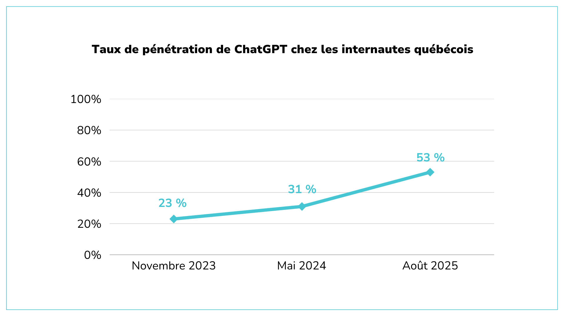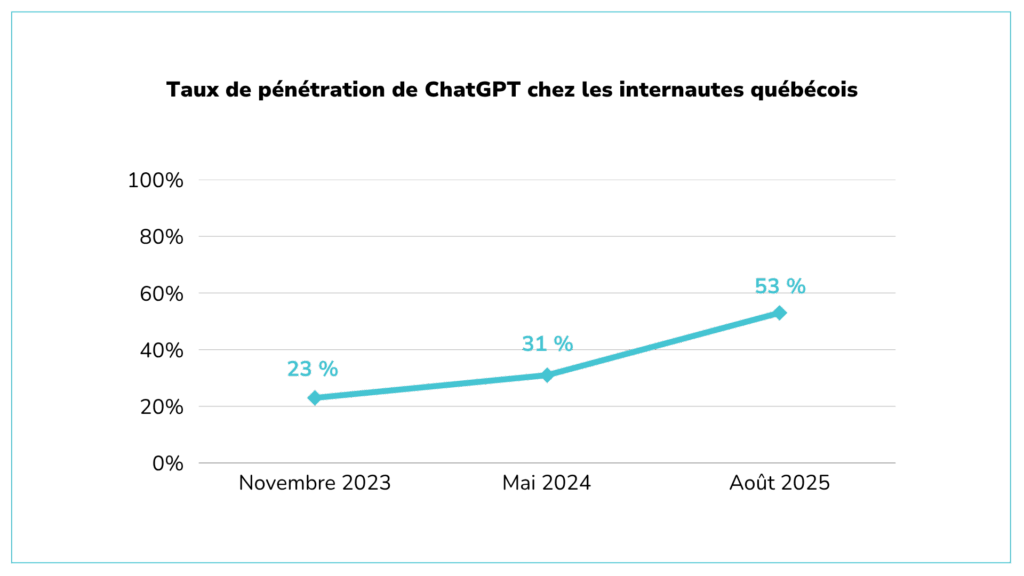 Près de trois ans après son lancement à grande échelle, ChatGPT est désormais utilisé par plus de la moitié des internautes québécois (53 %) et une très forte majorité de jeunes de 18 à 24 ans (92 %). Par ailleurs, la proportion d’utilisateurs hebdomadaires est passée de 7 % à 25 % au cours des 15 derniers mois, ce qui indique que le populaire programme d’OpenAI s’incruste de plus en plus dans notre quotidien.